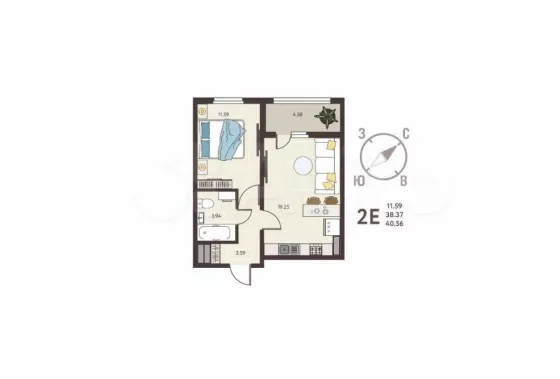 Евро-2 площадью 40.56 кв.м. Кухня-гостиная 19.25 кв.м. с выходом на застекленную лоджию, спальня 11.59 кв.м. В коридоре есть место для шкафа-купе.