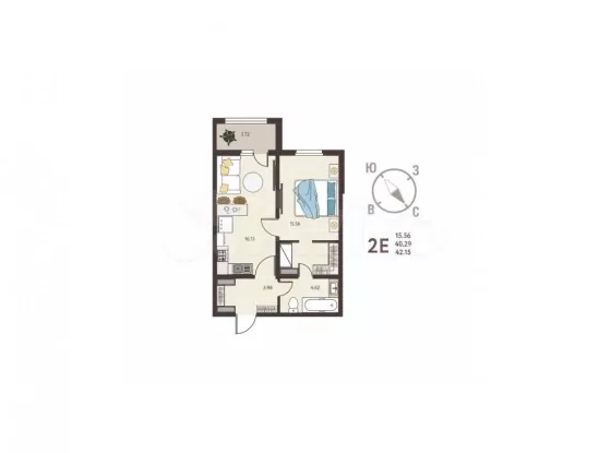 Евро-2 площадью 42.15 кв.м. Кухня-гостиная 16.13 кв.м. с выходом на застекленную лоджию. Панорамное остекление лоджии. Спальня 15.56 кв.м. Окно во двор. Вход в совмещенный санузел из жилой комнаты через кладовую и из коридора.