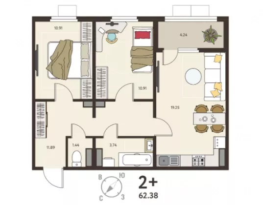Площадь, кв.м.62.38