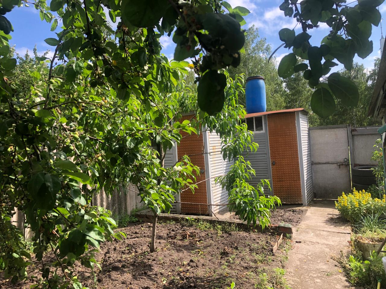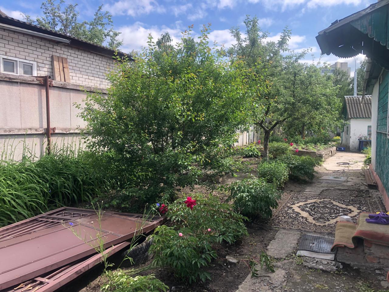 Просторный двор. Есть хозпостройки. Участок широкий по фасаду, угловой огороженный по периметру. На участке растут плодовые деревья и кустарники(яблони, груши, персик, смородина и др.).
