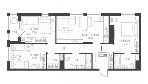 Планировка на разные стороны. Просторная кухня-гостиная 18,5кв м. Два санузла, один в спальне.