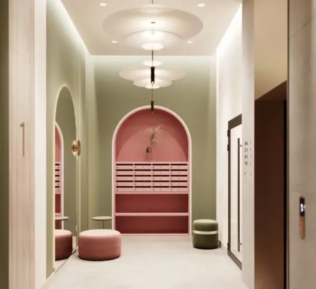 В OLIVIA закрытый, приватный внутренний двор без машин. В оформлении используются элементы ландшафтного дизайна.