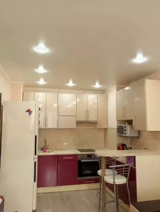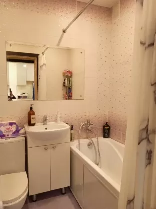 В квартире совмещенный санузел, оформленный в светлых тонах, и просторная лоджия, Кухня оборудована современной мебелью и техникой, включая варочную панель и духовой шкаф.