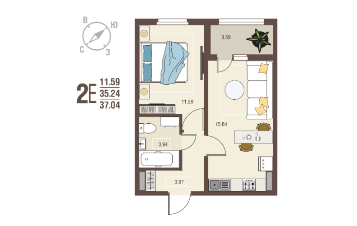 Общая площадь квартиры 37,04 кв.м. Жилая комната 11,59 кв.м. Кухня-гостиная 15,84 кв.м. Совмещенный санузел. Застекленная лоджия. Вид из окон - во двор.