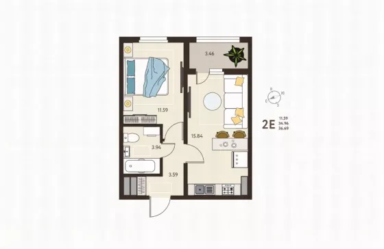 Общая площадь квартиры 36,69 кв.м. Жилая комната площадью 11,59 кв.м. Кухня-гостиная 15,84 кв.м. Совмещенный санузел. Застекленная лоджия.