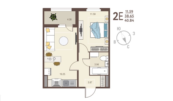 Общая площадь квартиры 40,84 кв.м. Жилая комната площадью 11,59 кв.м. Кухня-гостиная 19,25 кв.м. Совмещенный санузел. Застекленная лоджия.