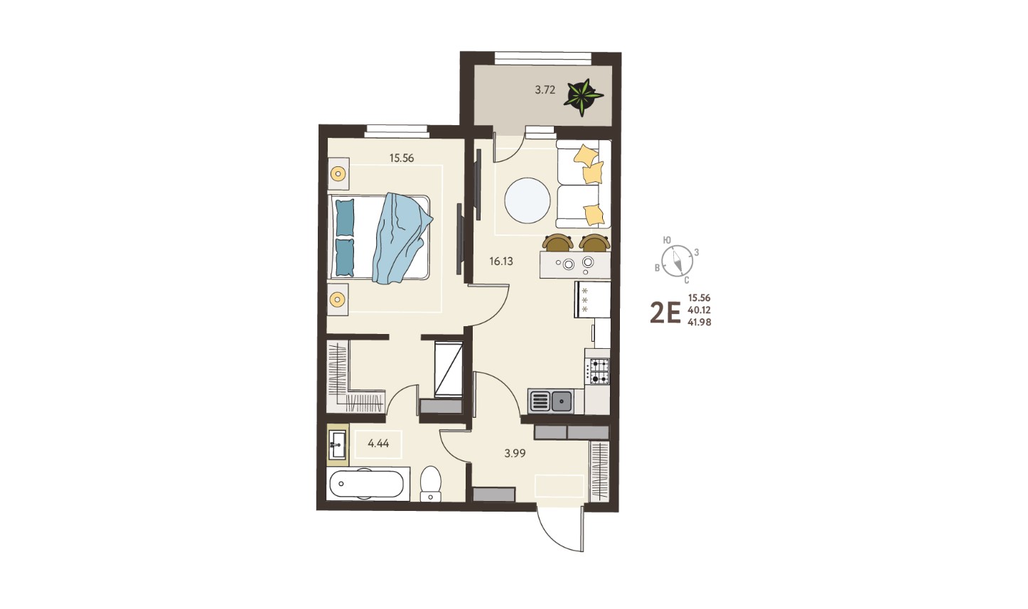 Общая площадь квартиры 41,98 кв.м. Жилая комната с кладовой 15,56 кв.м. Кухня-гостиная 16,13 кв.м. Совмещенный санузел. Просторная застекленная лоджия.