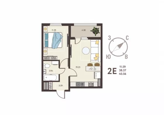 Евро-2 площадью 40.56 кв.м. Кухня-гостиная 19.25 кв.м. с выходом на застекленную лоджию, спальня 11.59 кв.м. В коридоре есть место для шкафа-купе. Санузел совмещенный.