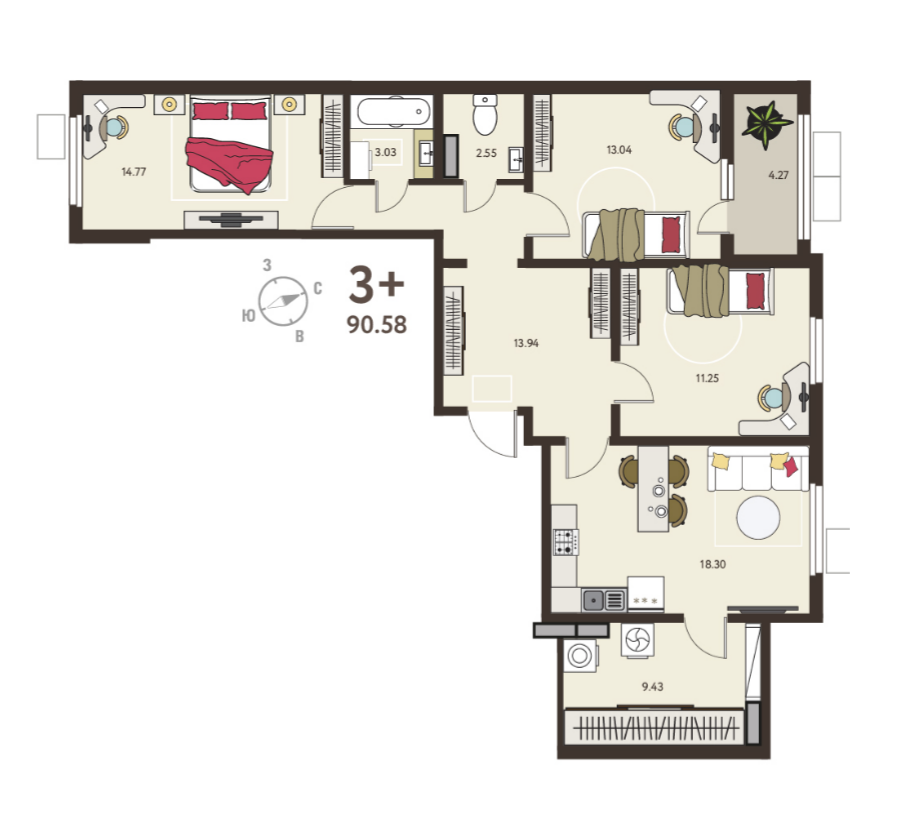 | Площадь, кв.м. | 90.58 |