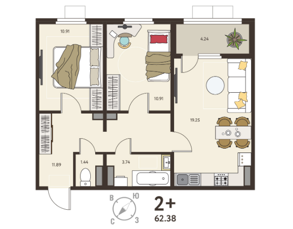 Площадь, кв.м.62.38