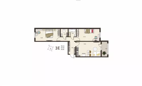 Общая площадь квартиры 64,81 кв.м. Кухня-гостиная 19,25 кв.м. с выходом на застекленную лоджию с увеличенным остеклением. 2 жилые комнаты площадью 15,68 кв.м., 14,76 кв.м. Раздельный санузел.