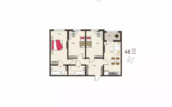 Общая площадь квартиры 78,94 кв.м. Кухня-гостиная 16,13 кв.м. 3 жилые комнаты площадью 16,13 кв.м., 12,89 кв.м., 12,81 кв.м. 2 санузла. Просторный холл 10,22 кв.м. Застекленная лоджия с увеличенным остеклением с выходом из жилой комнаты.