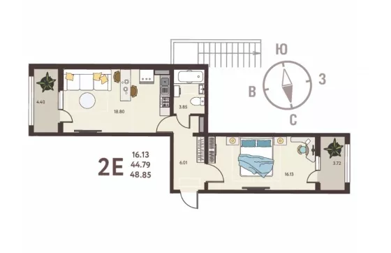 Общая площадь квартиры 48.85 кв.м. Кухня-гостиная 18,80 кв.м. Жилая комната 16,13 кв.м. 2 застекленные лоджии. Совмещенный санузел.