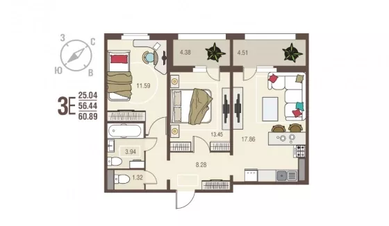 Общая площадь квартиры 60.89 кв.м. 2 жилые комнаты площадью 11.59 кв.м. и 13.45 кв.м. Кухня-гостиная 17.86 кв.м. 2 застекленные лоджии. 2 санузла. Вид из окон на ольховую рощу.