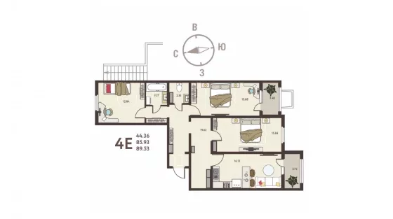 Общая площадь квартиры 89.53 кв.м. Кухня-гостиная 16.13 кв.м. Жилые комнаты площадью 12.84 кв.м., 15.68 кв.м., 15.84 кв.м. 2 застекленные лоджии. Раздельный санузел. Вид из окон на ольховую рощу, во двор.