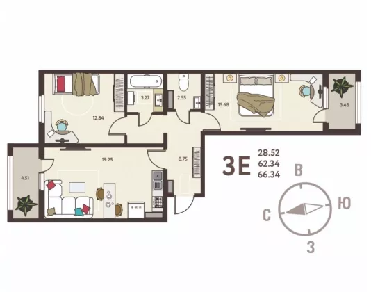 Общая площадь квартиры 66.34 кв.м. Жилые комнаты 12.84 кв.м., 15.68 кв.м. Кухня-гостиная 19.25 кв.м. 2 застекленные лоджии. Раздельный санузел. Вид из окон - во двор, на ольховую рощу.