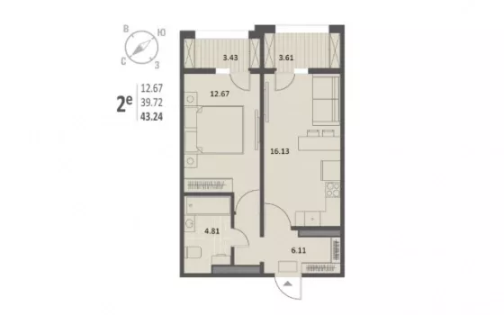 Общая площадь квартиры 43.24 кв.м. Жилая комната 12.67 кв.м. Кухня-гостиная 16.13 кв.м. Совмещенный санузел. 2 застекленные лоджии. Вид из окон - улица Краснознаменная.