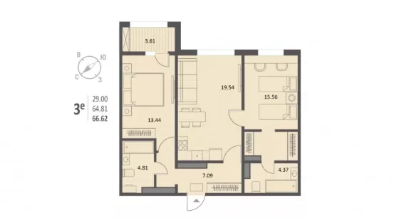 Общая площадь квартиры 66.62 кв.м. Жилая комната 15.56 кв.м. с гардеробной, жилая комната 13.44 кв.м. Кухня-гостиная 16.13 кв.м. 2 просторных совмещенных санузла. Застекленная лоджия. Вид из окон - улица Краснознаменная.