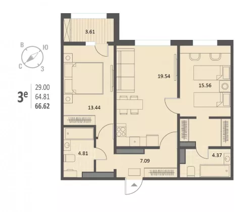 Общая площадь квартиры 66.62 кв.м. Жилая комната 15.56 кв.м. с гардеробной, жилая комната 13.44 кв.м. Кухня-гостиная 16.13 кв.м. 2 просторных совмещенных санузла. Застекленная лоджия. Вид из окон - улица Краснознаменная.
