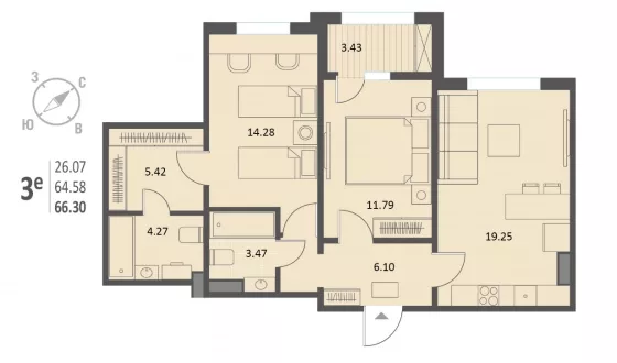 Общая площадь квартиры 66.30 кв.м. 2 жилые комнаты площадью 14.28 кв.м.,11.79 кв.м. Кухня-гостиная 19.25 кв.м. Гардеробная 5.42 кв.м. 2 совмещенных санузла. Застекленная лоджия. Вид из окон - двор.