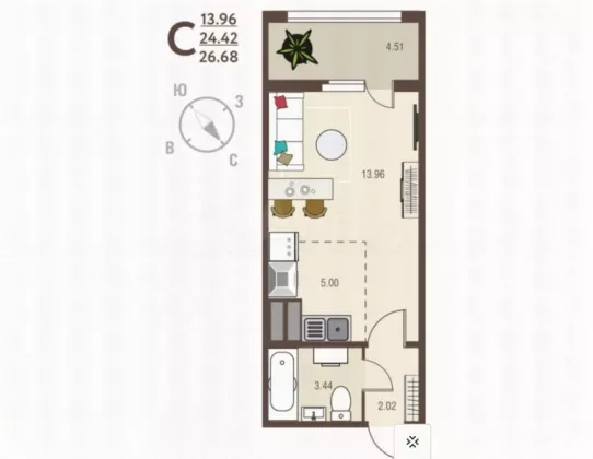Планировка с совмещением кухни и комнаты позволяет рационально использовать пространство. Просторная комната с выходом на балкон. Санузел совмещенный.