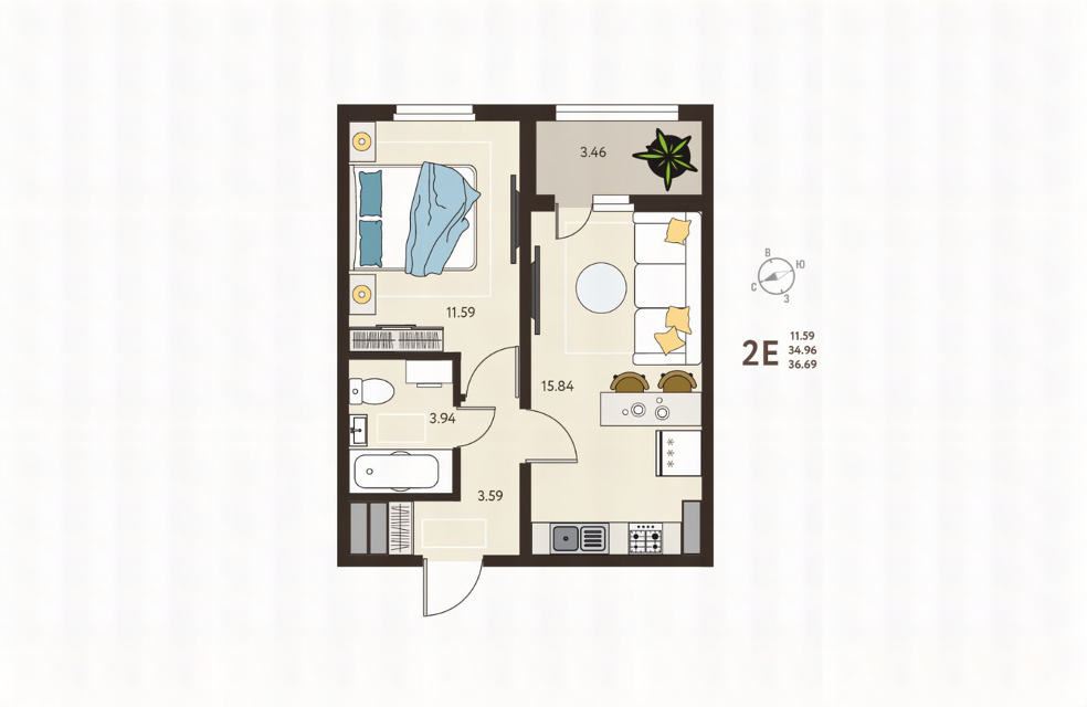 Общая площадь квартиры 36,69 кв.м. Жилая комната площадью 11,59 кв.м. Кухня-гостиная 15,84 кв.м. Совмещенный санузел. Застекленная лоджия.
